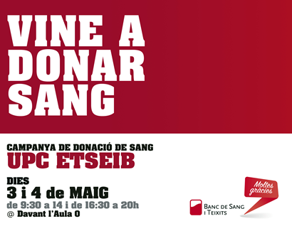 - El pròxim 3 i 4 de maig vine a donar sang! Davant l'Aula 0. De 9.30 a 14 h. I de 16,30 a 20 h.